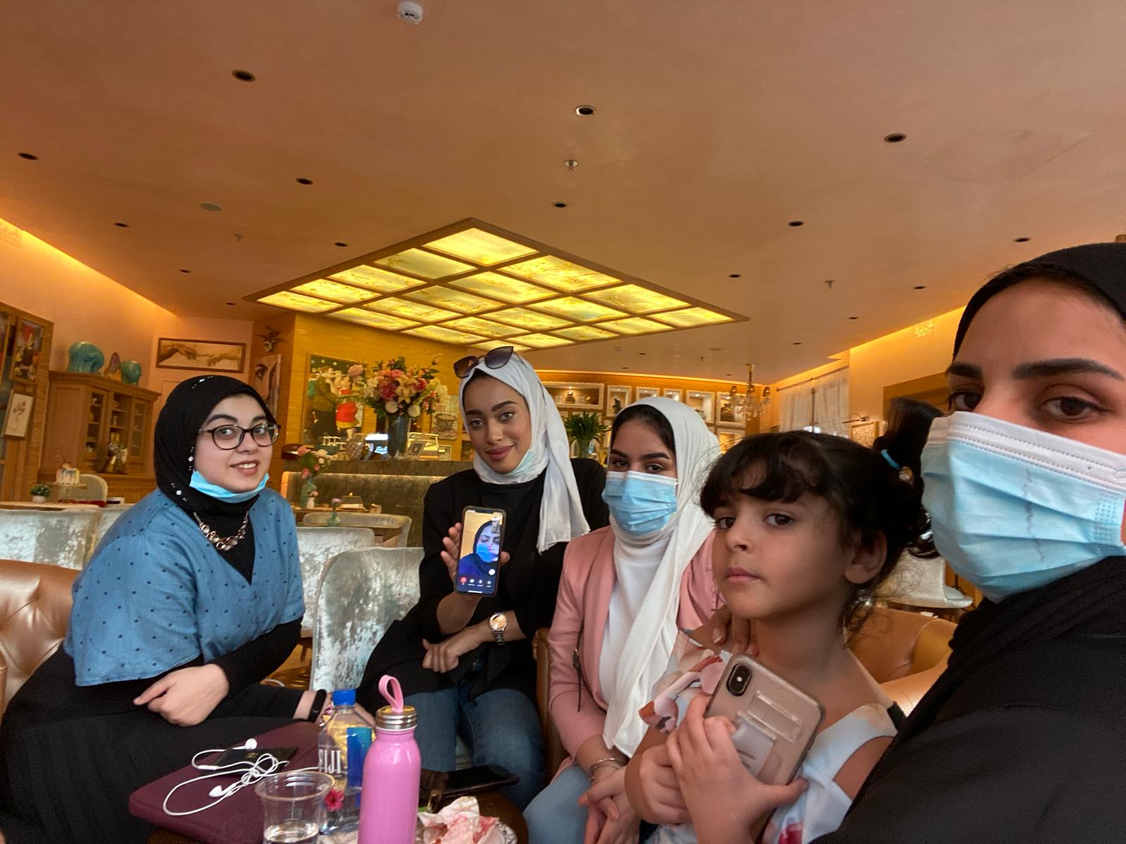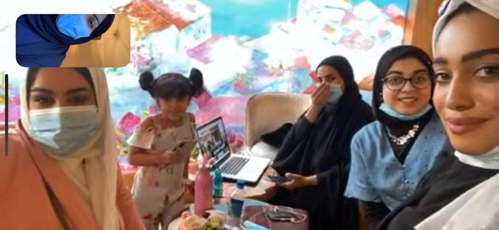 اجتمعت مع زملاتي ولكن هذه المرة كانت مختلفه جدا، كان الاجتماع عن طريق الفيس تايم وذلك لإصابة افراد عائلتي بفايرس كارونا وبما اني مخالطة لهم لا استطيع الاختلاط بزميلاتي، و مع وجود طرق التواصل لم يمنعنا شيء.